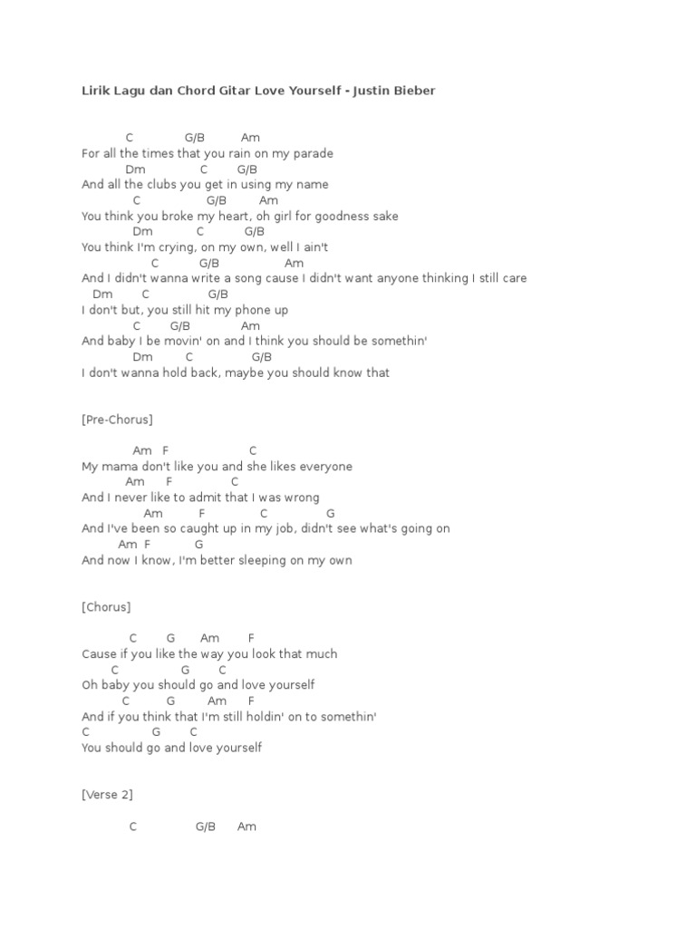 Selasa 5 April 2022 1248 WIB. Lirik Kunci Gitar Justin Bieber - Love Yourself. C For all the times that G Am you rain on my parade Dm And all the clubs you get C G in using my name C You think you broke my heart G Am oh girl for goodness sake Dm You think Im crying C G on my own well I aint C And I didnt wanna write a G song cause I didnt Am want anyone thinking I still care Dm C I dont but you.